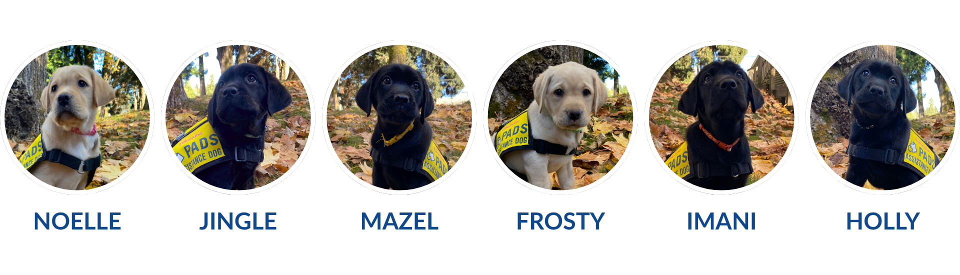 This GivingTuesday, help PADS puppies Frosty, Holly, Jingle, Noelle, Imani, and Mazel grow into life-changing assistance dogs.